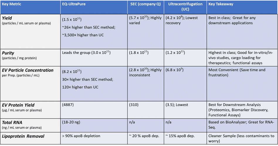 - ExoQuick® UltraPure: Unmatched Quality, Backed by Data - the only kit delivering high yield, high purity, concentrated EVs with superior protein, total RNA, and cleaner samples
