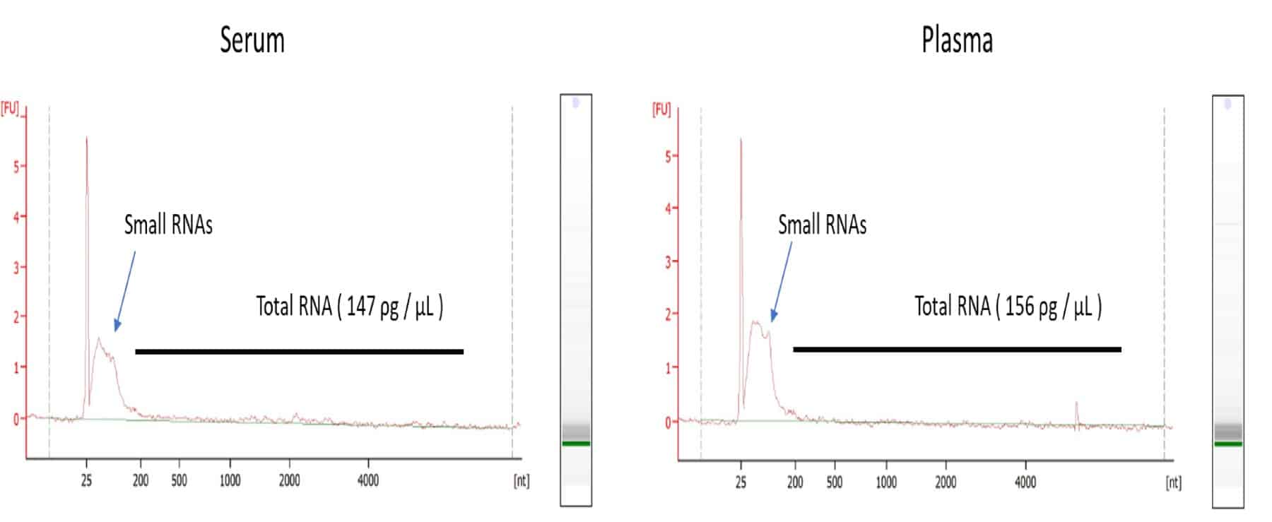 Figure 5. EV RNA Quality Assessment by BioAnalyzer EV RNA isolated with EQ UltraPure and the EVery EV RNA Kit (Cat# Every100B-1) shows high quality by Agilent Bioanalyzer electropherogram and gel analysis.