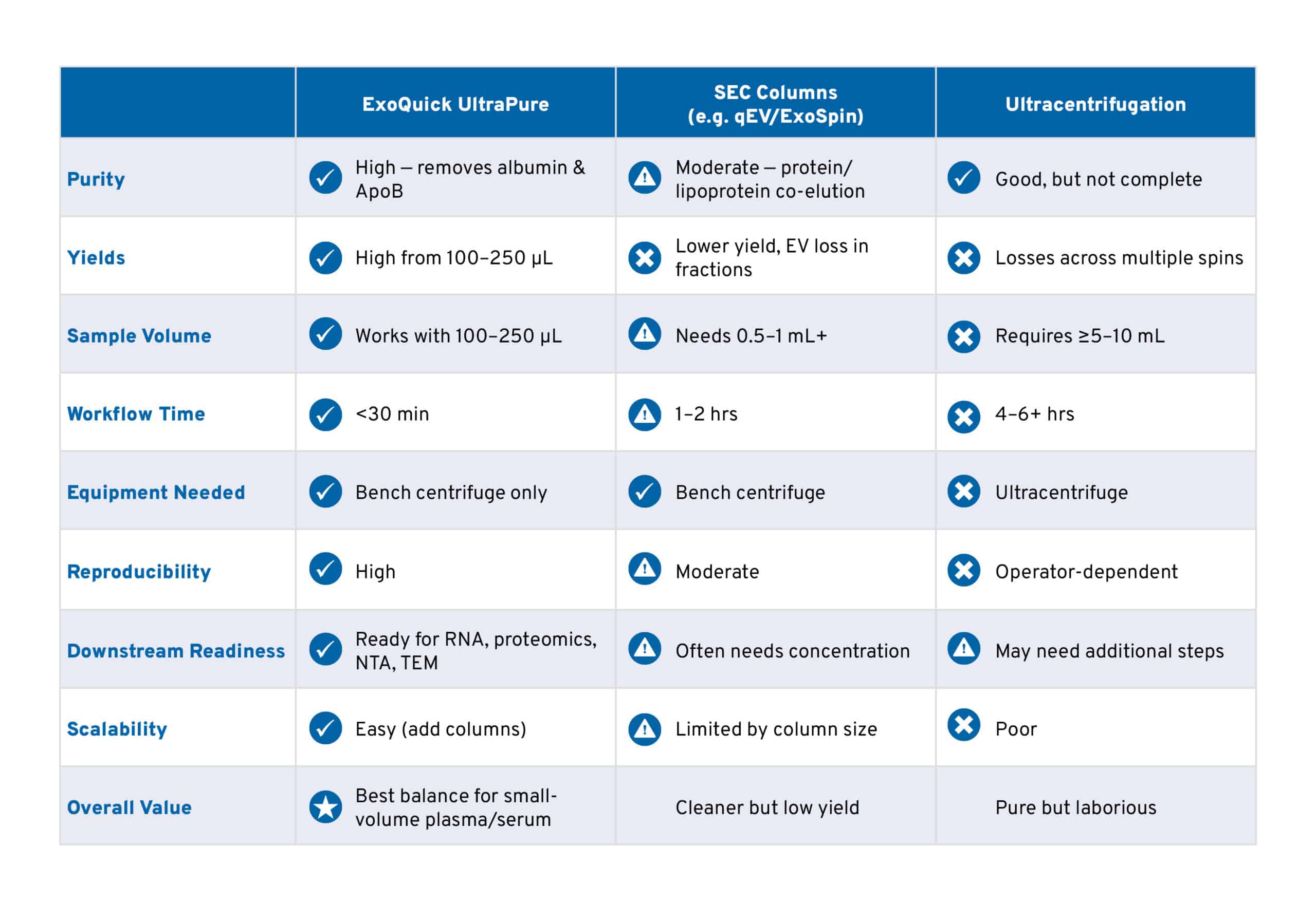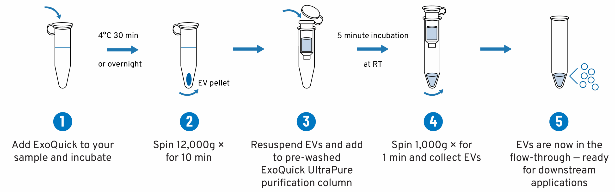 Why choose between yield and purity? With SBI’s ExoQuick® UltraPure, you get both. Our next-generation EV isolation kit combines proprietary precipitation with advanced mixed-mode spin-column technology to deliver higher yields, cleaner EVs, and reliable results in just 20 minutes—no ultracentrifuge required.